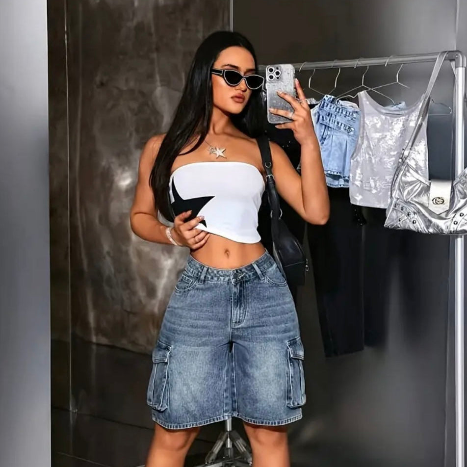 Bermuda de jean, tela gruesa de tiro alto con ajuste en la cintura y caída holgada.