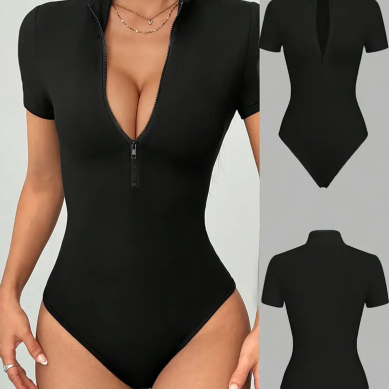 Body de Mujer Ajustado con Cremallera y Manga Corta - Top Versátil para Todas las Estaciones, Lavable a Máquina, Cuello Redondo Elástico, Moda Moderna, Elasticidad Media