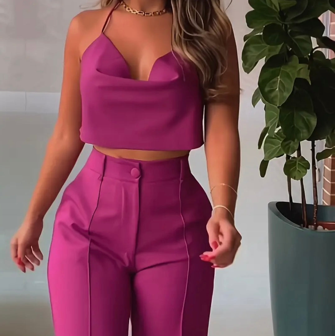Conjunto elegante y seductor de top con tirantes y pantalones tiro alto recto.