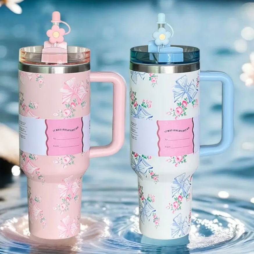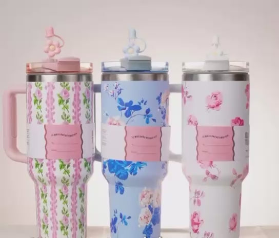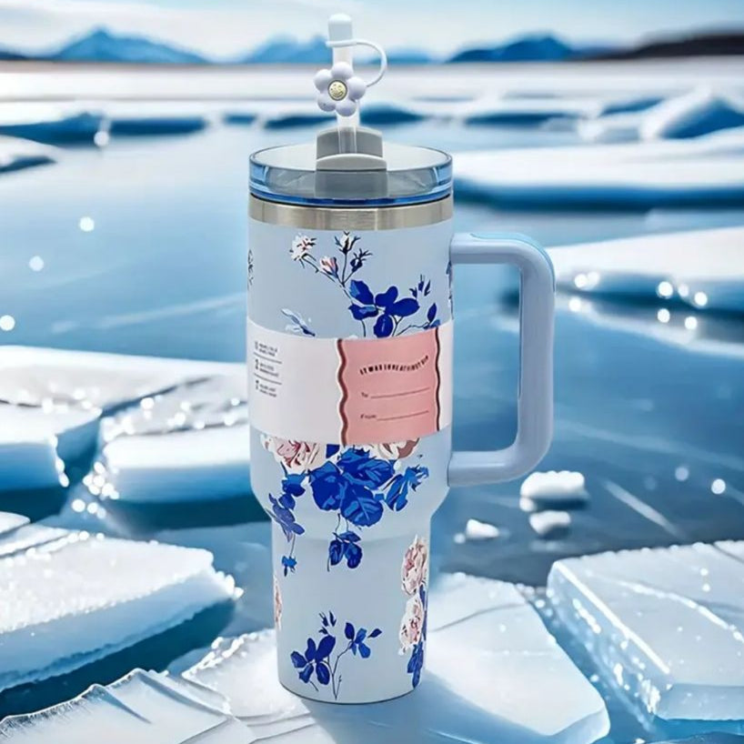 Un termo de 1L con asa y sorbete de flor, con doble pared de vacío y fabricado de acero inoxidable, de colores premium es perfecta para viajes, acampar al aire libre, senderismo, conducir y disfrutar de café helado.